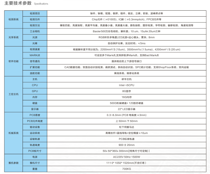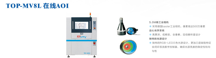 TOP-MV8L在線型AOI 采用德國Basler工業(yè)相機(jī),像素高達(dá)500萬像素。高景深,低畸變,全像素,定倍解析設(shè)計(jì)。