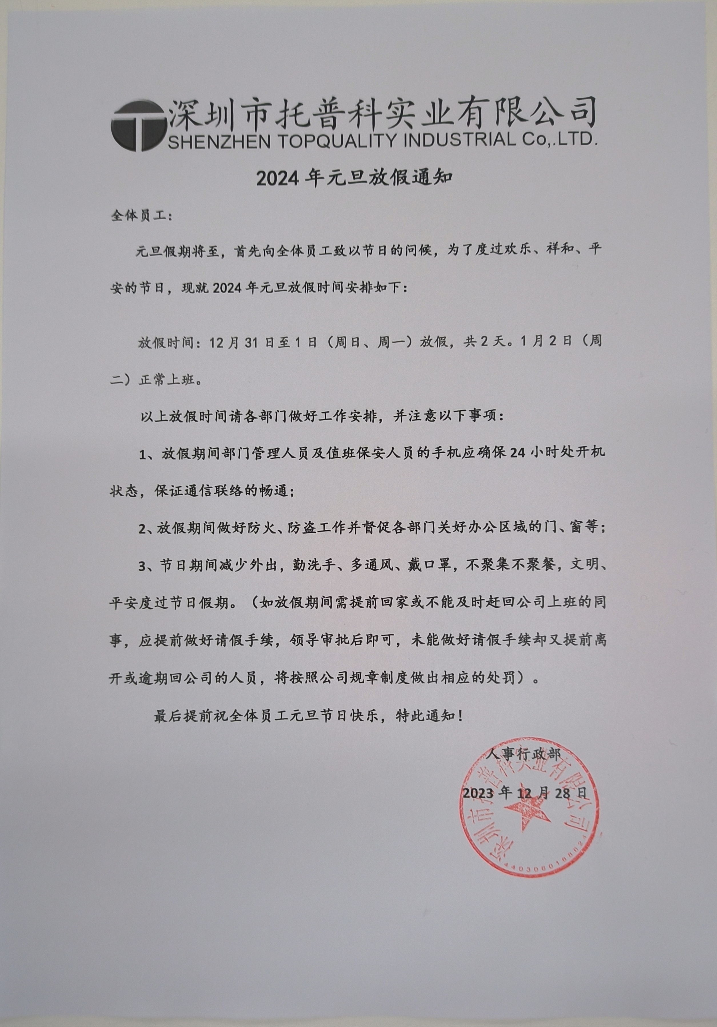 2024元旦即將來臨,根據有關規定,結合公司實際情況,現將2024年元旦節放假事項通知如下: