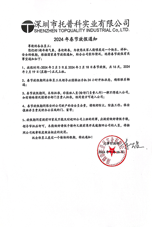 深圳市托普科實業(yè)2024年春節(jié)放假通知