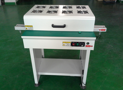 aoi位于smt生產(chǎn)線的后段,是通過接駁臺(tái)連接回流焊,因經(jīng)過回流焊高溫焊接(通常會(huì)達(dá)到220攝氏度),而在經(jīng)過冷卻區(qū)后,某些pcba板子的余溫還是比較高,因?yàn)樵诨亓骱负竺妫碼oi前)加冷卻接駁臺(tái),冷卻接駁臺(tái)顧名思義就是起到冷卻的作用,目的是為了加快剛焊接出來的pcba板降溫,相對于普通的接駁臺(tái),就是在接駁臺(tái)上方加了許多的風(fēng)扇,使pcba通過接駁臺(tái)的時(shí)候可以更快降溫。冷卻接駁臺(tái)如下圖所示